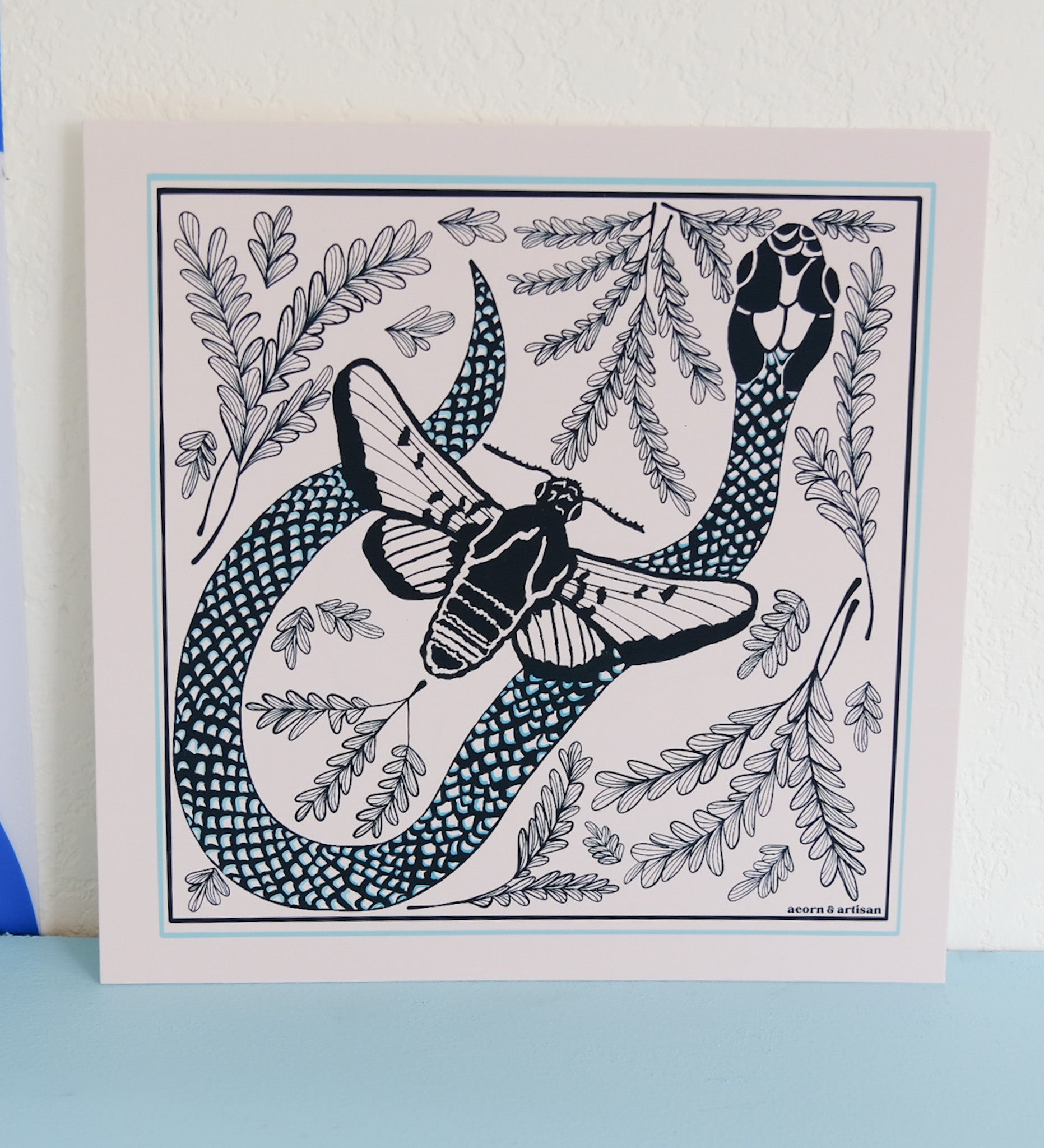 Art print featuring an original illustration of a prairie sphinx moth and speckled racer snake. Printed on premium heavyweight matte paper with archival-quality inks. Available in multiple square sizes and designed for display in home, studio, or creative spaces.